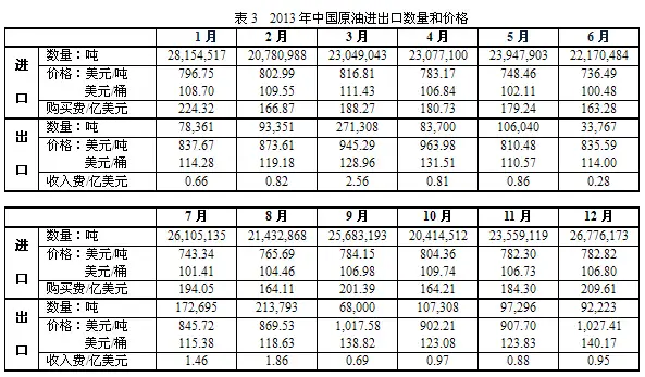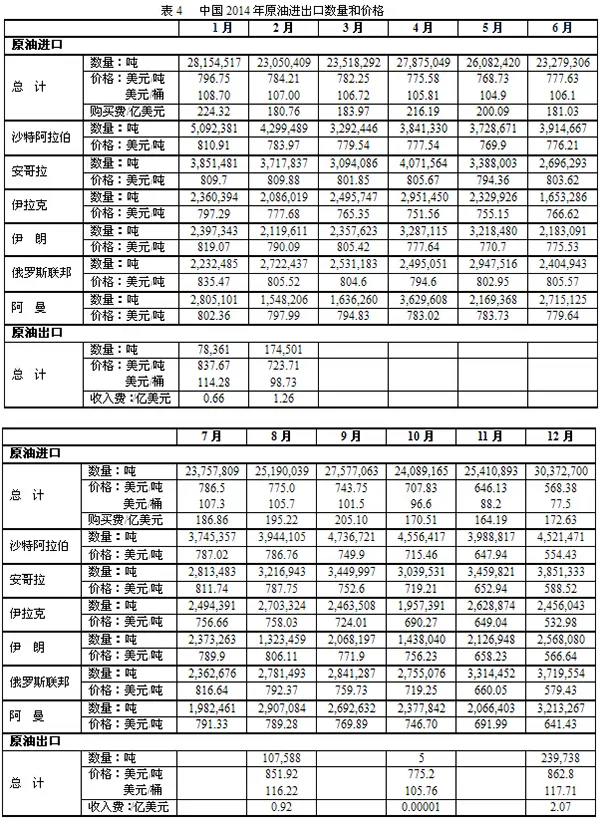 本文只涉及中国原油进出口数据和价格,不包括成品油进出口数据和价格。由于全球2014年原油生产、消费和贸易数据尚未发表,因此本文无法涉及。