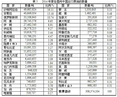 2014年度各国向中国出口原油的数量